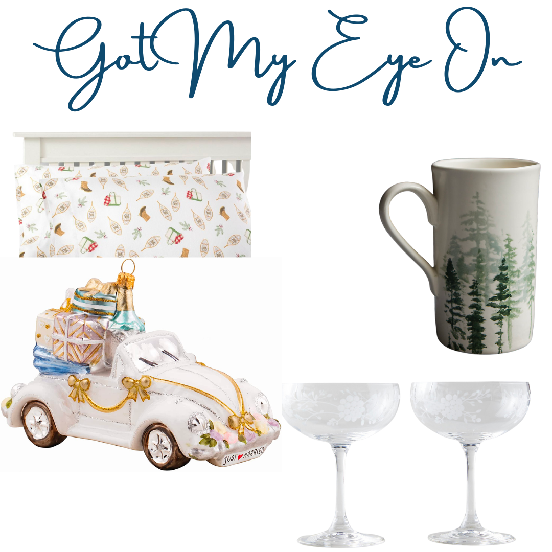 Winter Sheet Set // Evergreen Mug // Floral Coupe Glasses // Just Married Ornament //