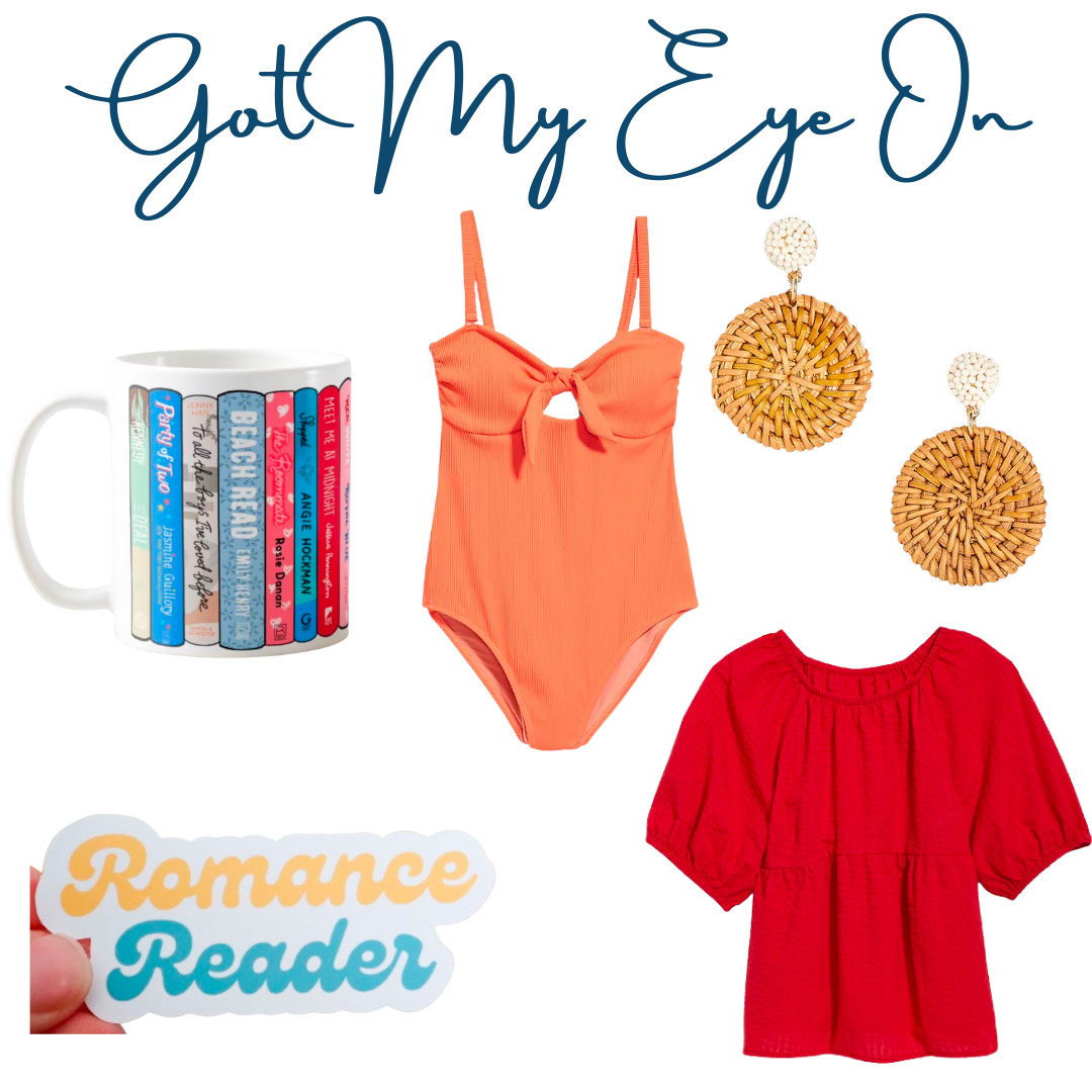 Romance Stack Mug // Romance Reader Sticker // Rattan Earrings // Red Top // Coral Bathing Suit
