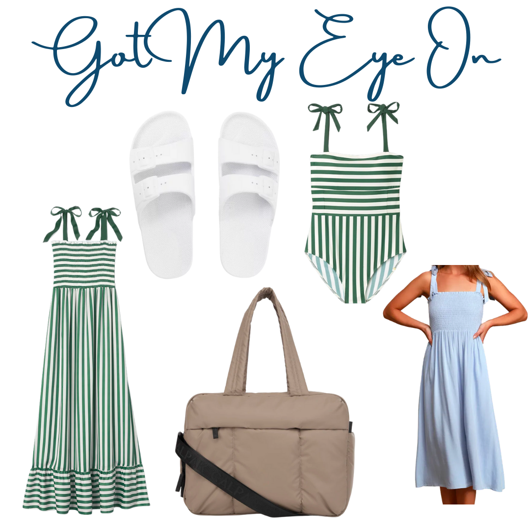 Striped Dress // Bathing Suit // CalPak Duffel // White Sandals // Light Blue Smocked Dress //