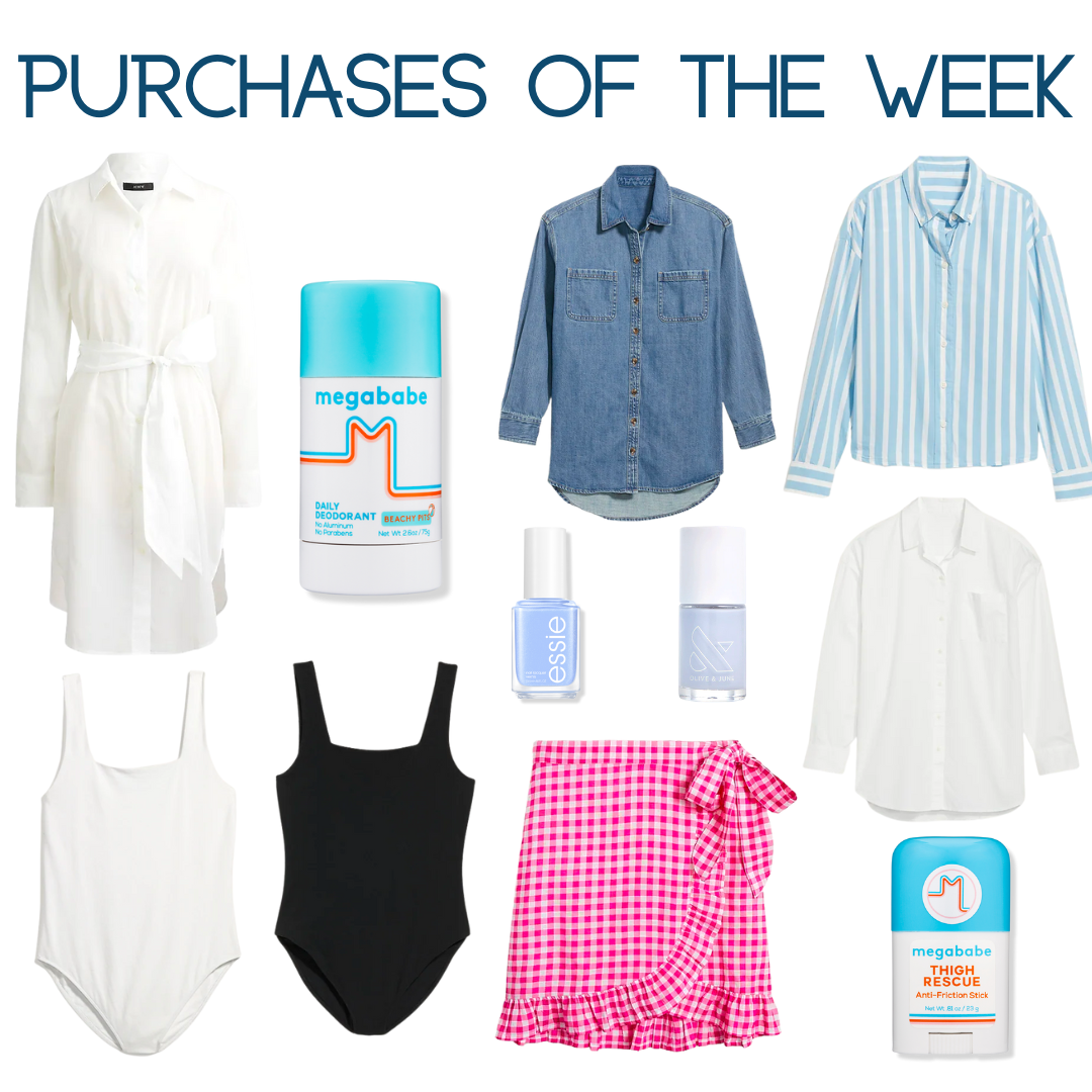 Shirt Dress Cover Up // Gingham Wrap Skirt // White Bodysuit // Black Bodysuit // Denim Button Down // White Button Down // Striped Shirt // Thigh Rescue // Mega Babe Beachy Pits // Essie Bikini So Teeny // Olive & June BP