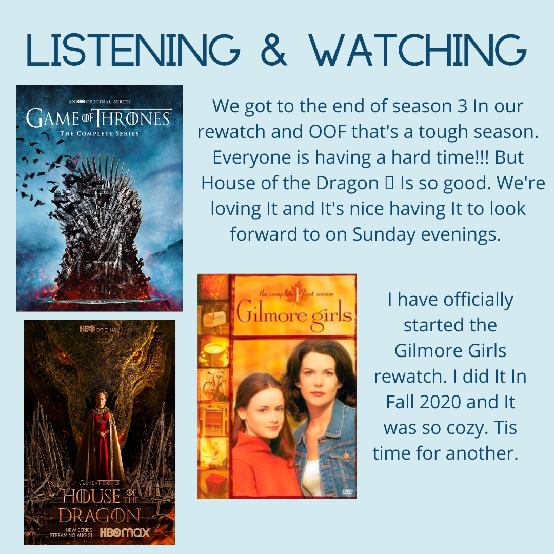 This week finally feels like we’re in the swing of Fall. The temperatures dipped (though it’s going to get warm again next week I think) and I am back to my schedule of teaching one day a week! Not to mention, I caved and started my Gilmore Girls rewatch. Between football on the TV three nights a week, school, and the sun setting earlier and earlier each night…I think Fall is here.