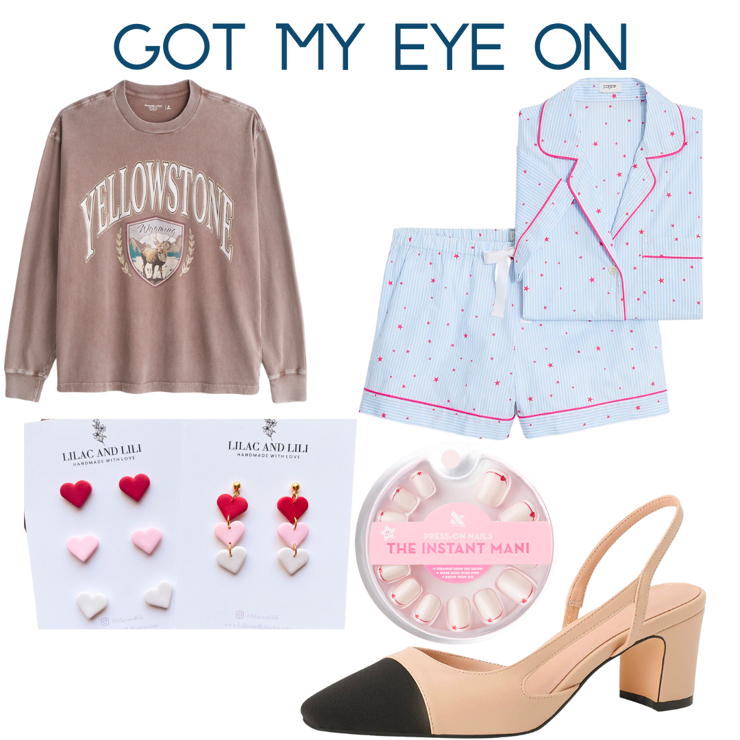 PJ Set // Yellowstone Crewneck // Valentine’s Day Earrings // Sling Back Shoes // Valentine’s Day Press On Nails //
