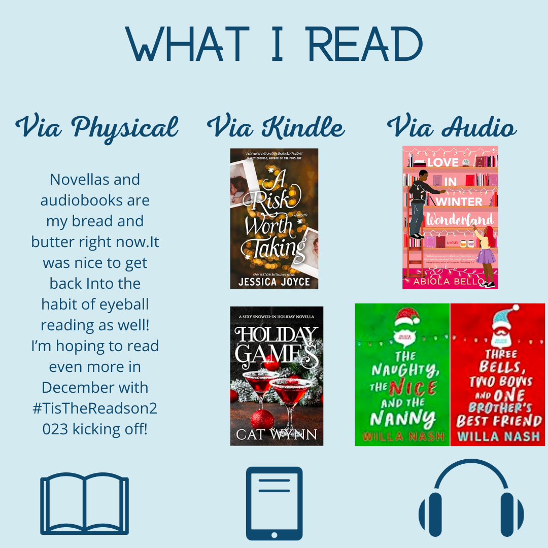 I hope you’re excited for the coziest and busiest month as well. I can’t wait to read together for Tis the Readson 2023 and enjoy the holidays with Nick. We actually have our first holiday party this weekend and I’m going to see The Nutcracker with my mom! I saw Jinx and Dela’s Holiday Show last Sunday too and it was SO much fun to do that with my best friend. I hope you had a great Thanksgiving holiday if you celebrated and a great first weekend of December!