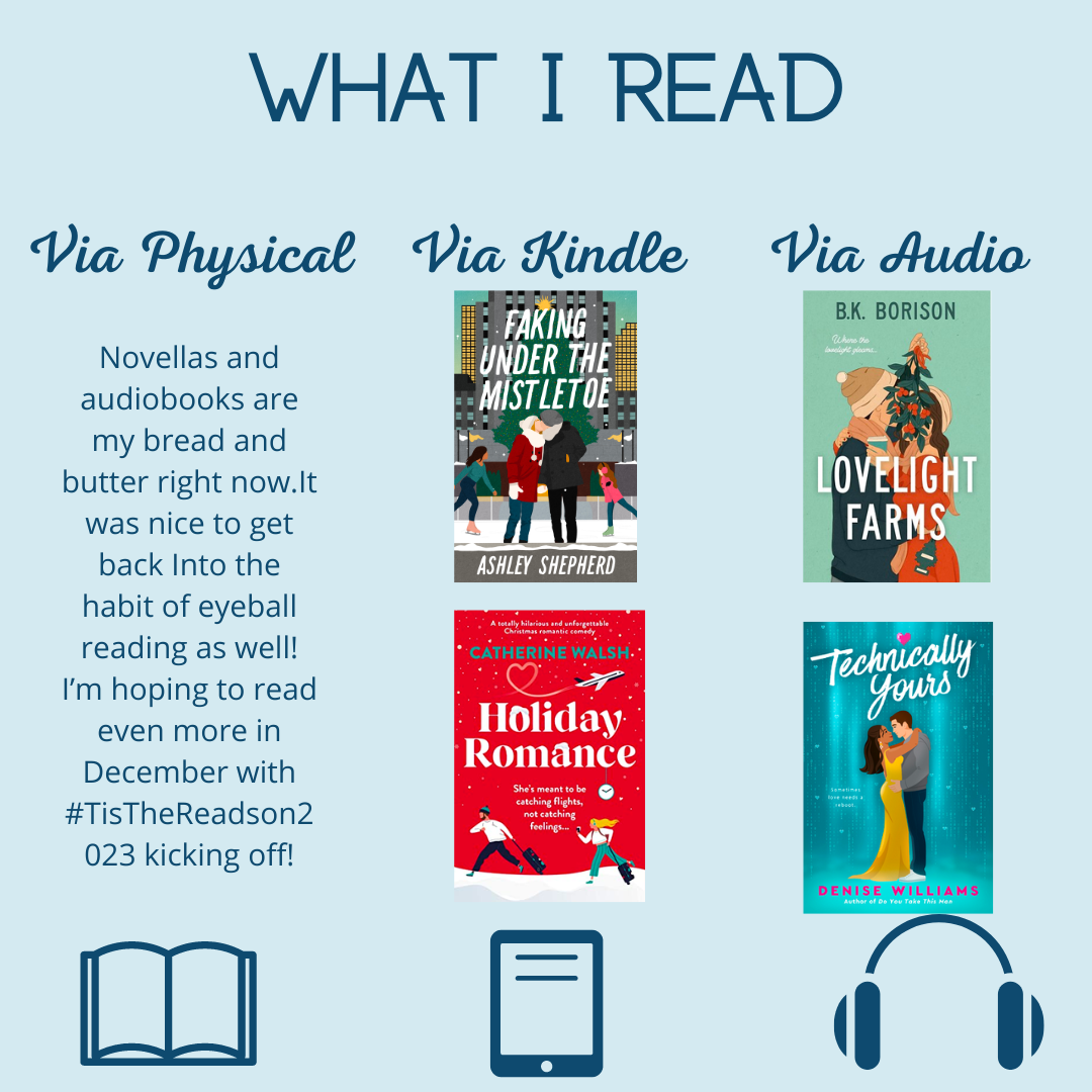The first week of December is in the books, literally. I finally am back in a good eyeball reading groove thanks to revisiting a favorite Christmas read, Faking Under the Mistletoe! While things have still been tough for me personally, the wonder and beauty of the lights of the season have definitely helped calm me down and enjoy the little things.