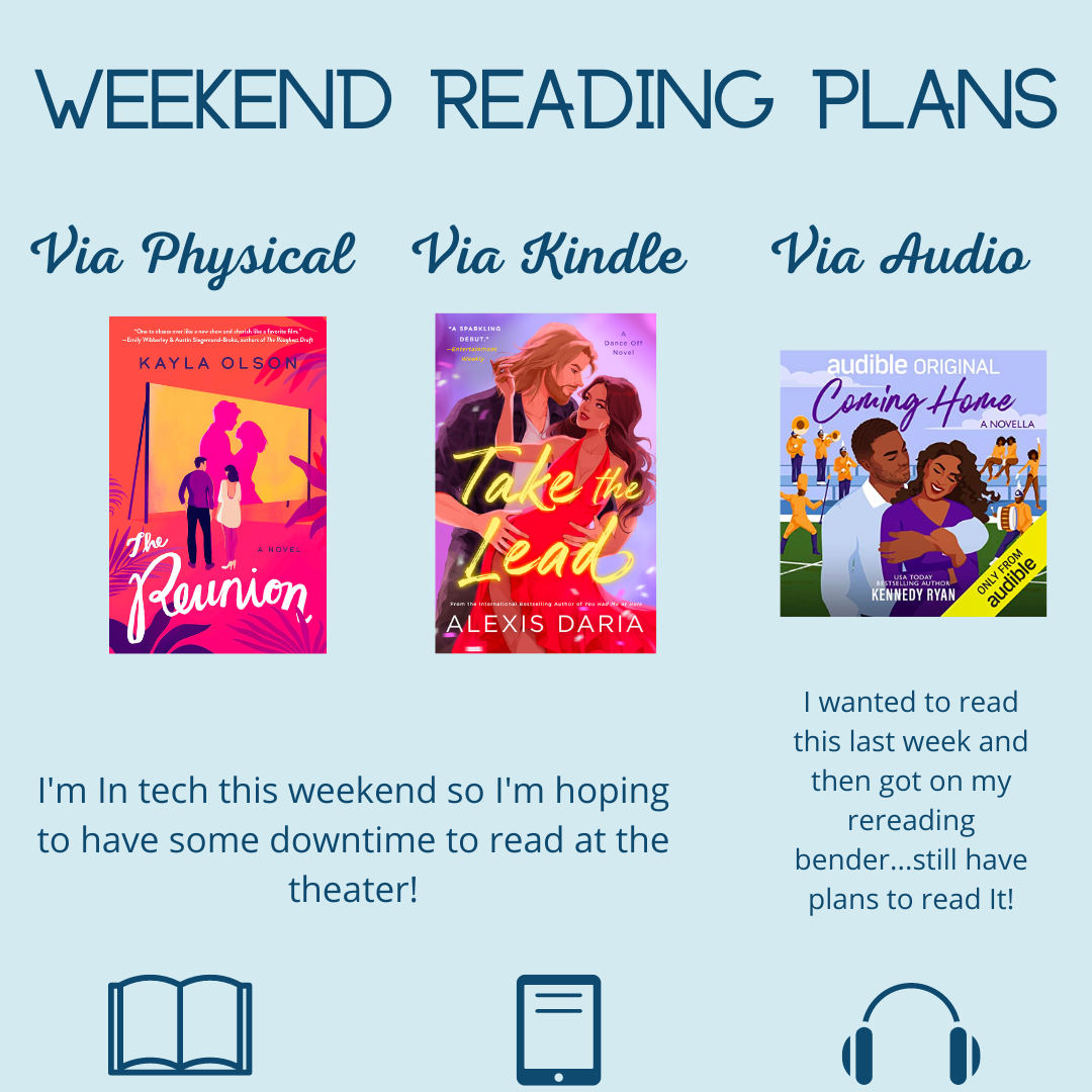 I’m in tech this weekend and I’m going to see the Into the Woods tour! It’s my FAVORITE show and I saw it in New York in August with most of the City Center cast but I’m excited to see the touring cast! It’s a busy busy weekend but I’m loving it. Happy reading!