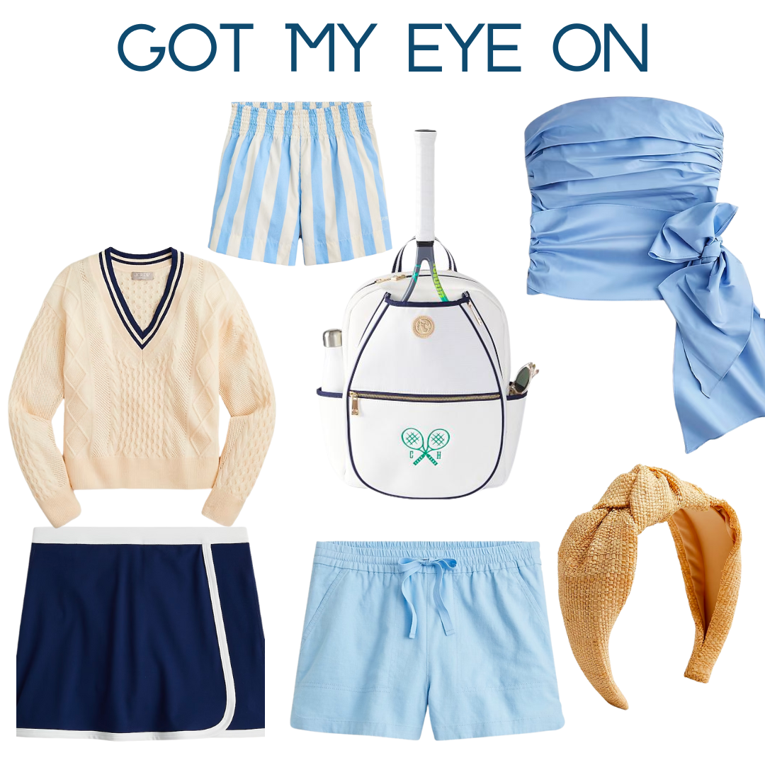 Blue Top // Tennis Skirt // Cashmere Sweater // Linen Shorts // Tennis Bag // Raffia Headband // Striped Shorts