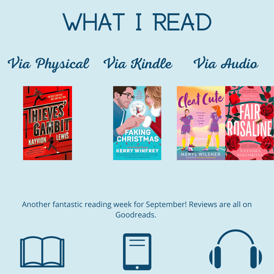 And I read four books! I enjoyed Cleat Cute, but i felt like the characters lacked chemistry. Thieves Gambit was so fast paced and my goodness, the cliffhanger! I wasn’t prepared. I had the best time reading Faking Christmas and you need to add it to your holiday TBRs. And the most surprising book of the week was Fair Rosaline! It wrecked me and angered me, in the best way.