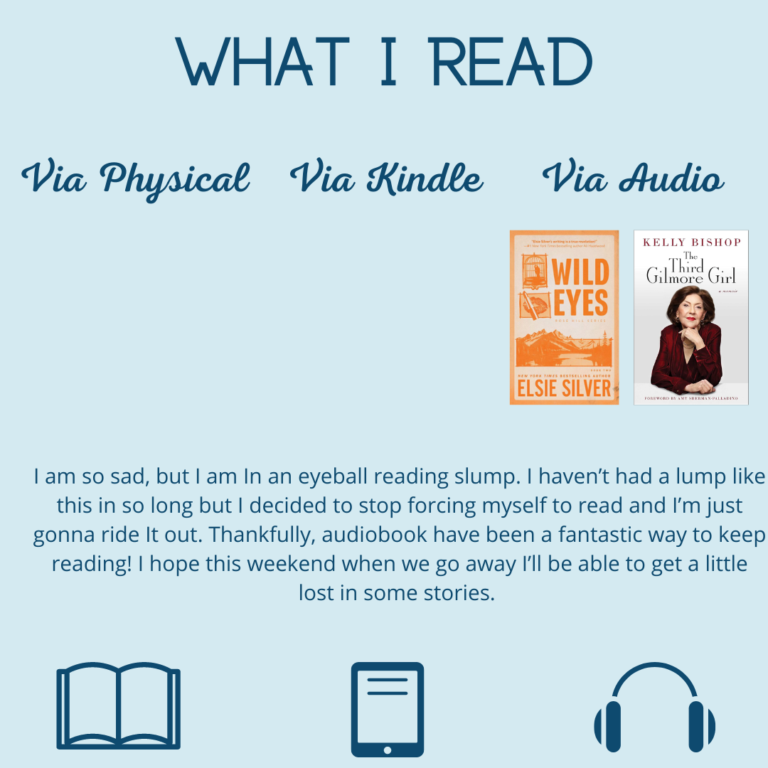 I am in the middle of a reading slump so I feel like I have nothing revolutionary to share here, but my audiobook experience was great this week. I LOVED Kelly Bishop’s memoir. She reads the audiobook so I highly recommend it! I listened via Libro.fm aka my favorite audiobook service.